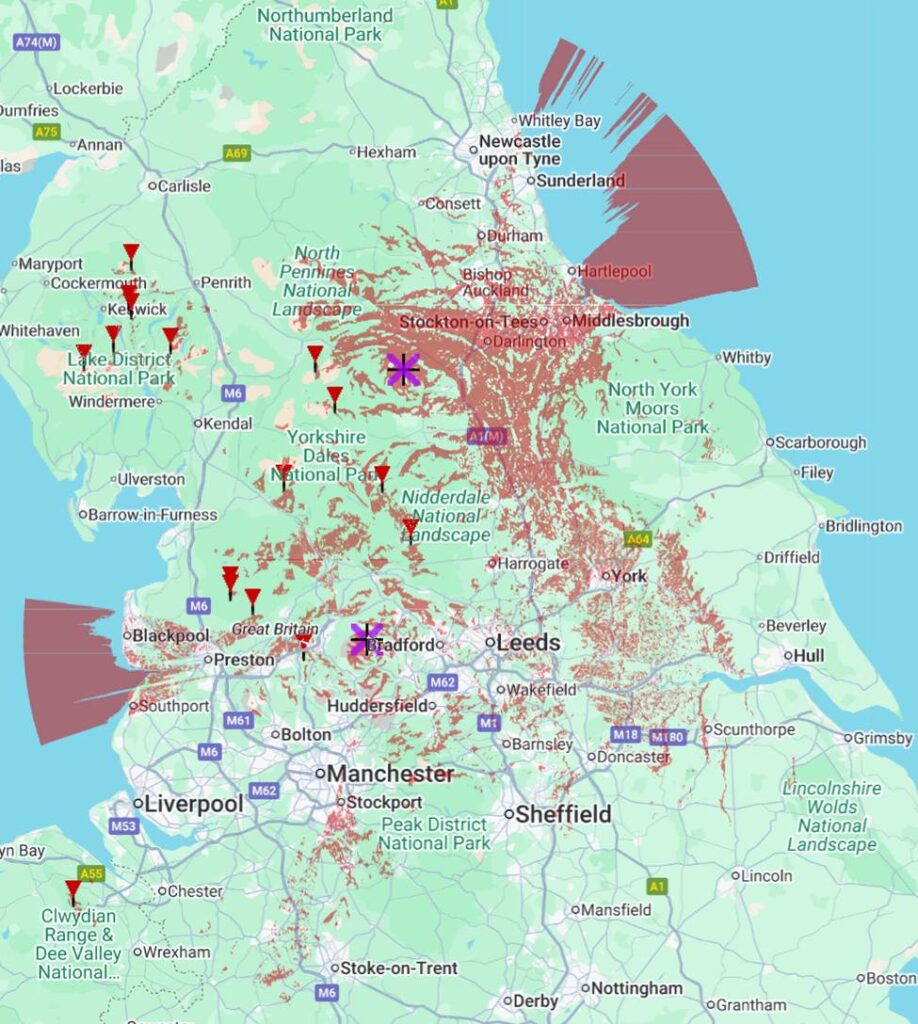 As an indication of the ZTV of the proposed Fred Olsen industrial-scale wind farm at Hope Moor, an analysis was requested from heywhatsthat.com using the following parameters:
