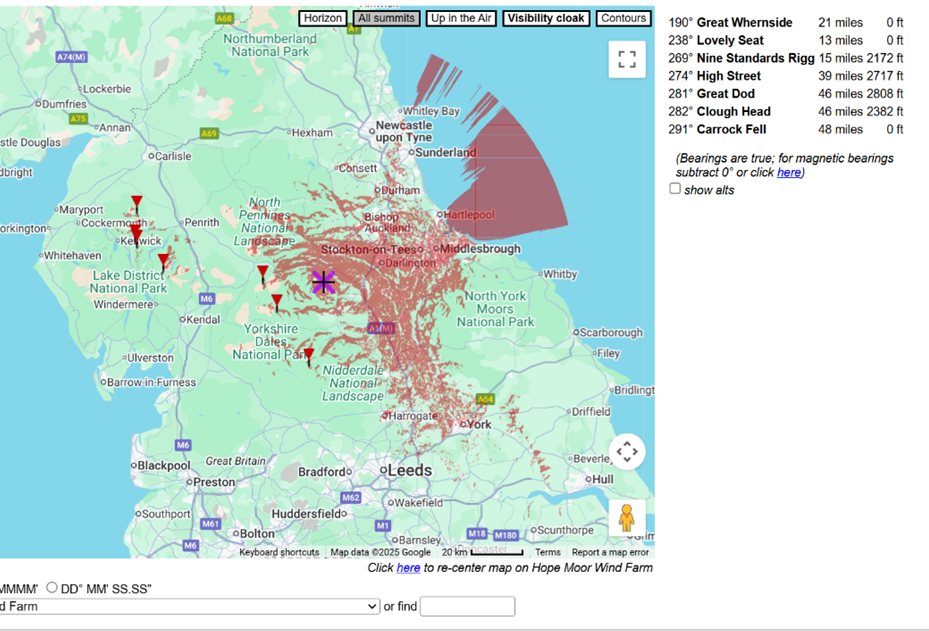 Little Whernside is one example. The ZTV analysis shows that the proposed Fred Olsen industrial-scale wind farm at Hope Moor would be visible from the Lake District to the North Sea, from Tyneside to York — despoiling the landscapes of several National Parks and Areas of Outstanding Natural Beauty in the process.
