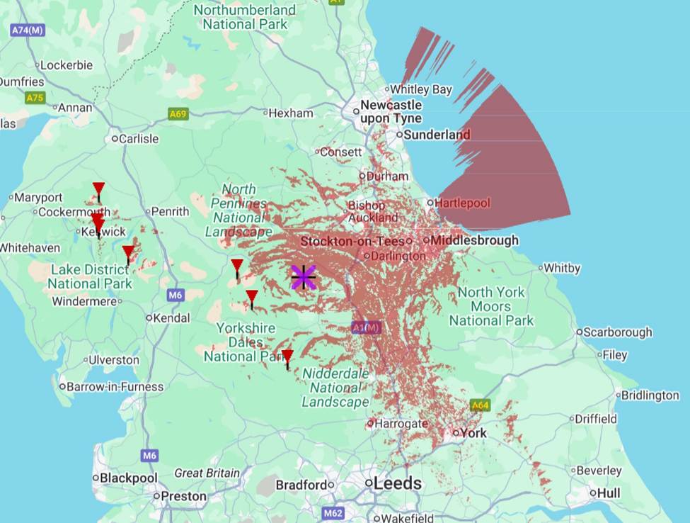 Another problem with the original Fred Olsen Renewables image is that it has a hilly landscape around it, implying that the turbines will likely be hidden behind hills. This is not the case for Hope Moor, which is a high, flat peak that can be seen across large swathes of the North East. This is illustrated by a Zone of Theoretical Visibility analysis – showing from where in the north the proposed wind farm will be visible: